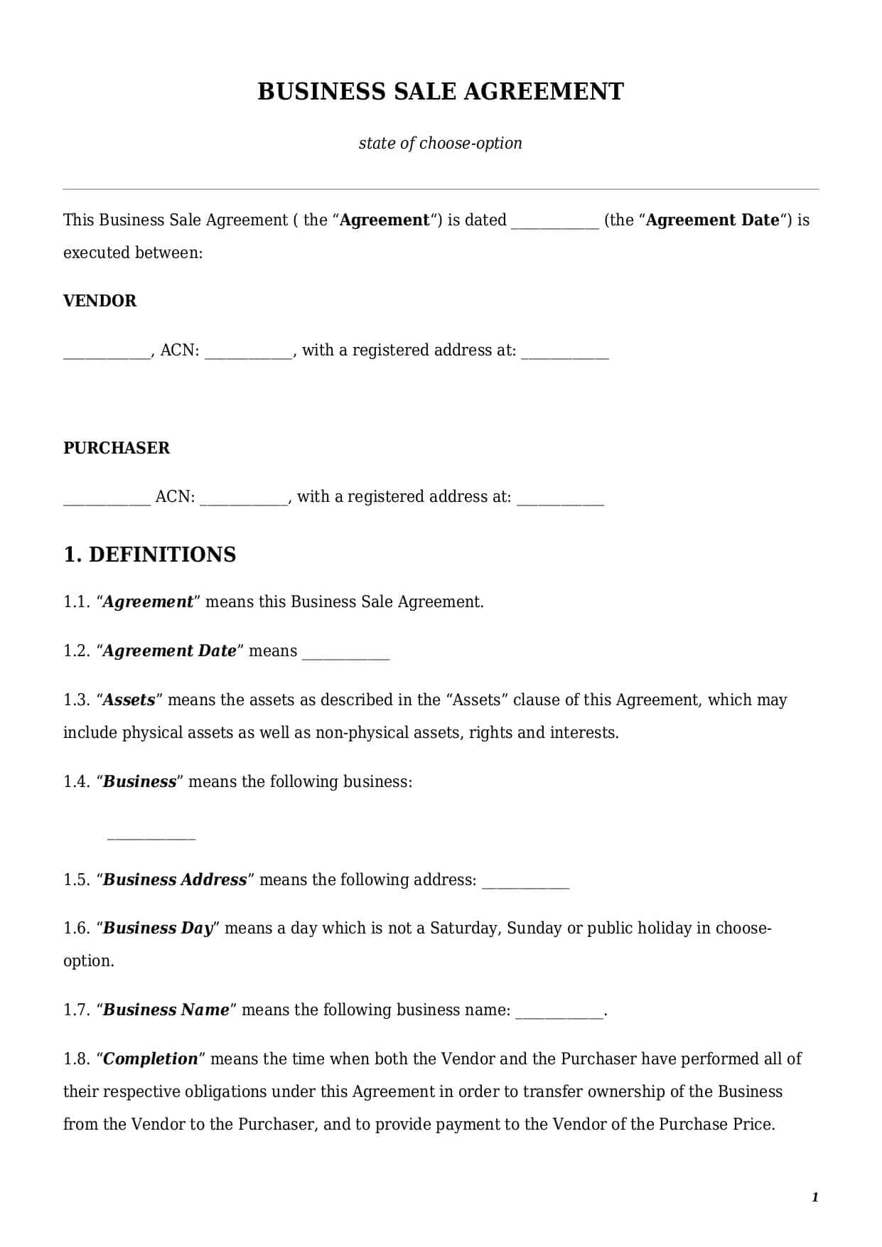 Upon the purchase of this sale of business agreement template: