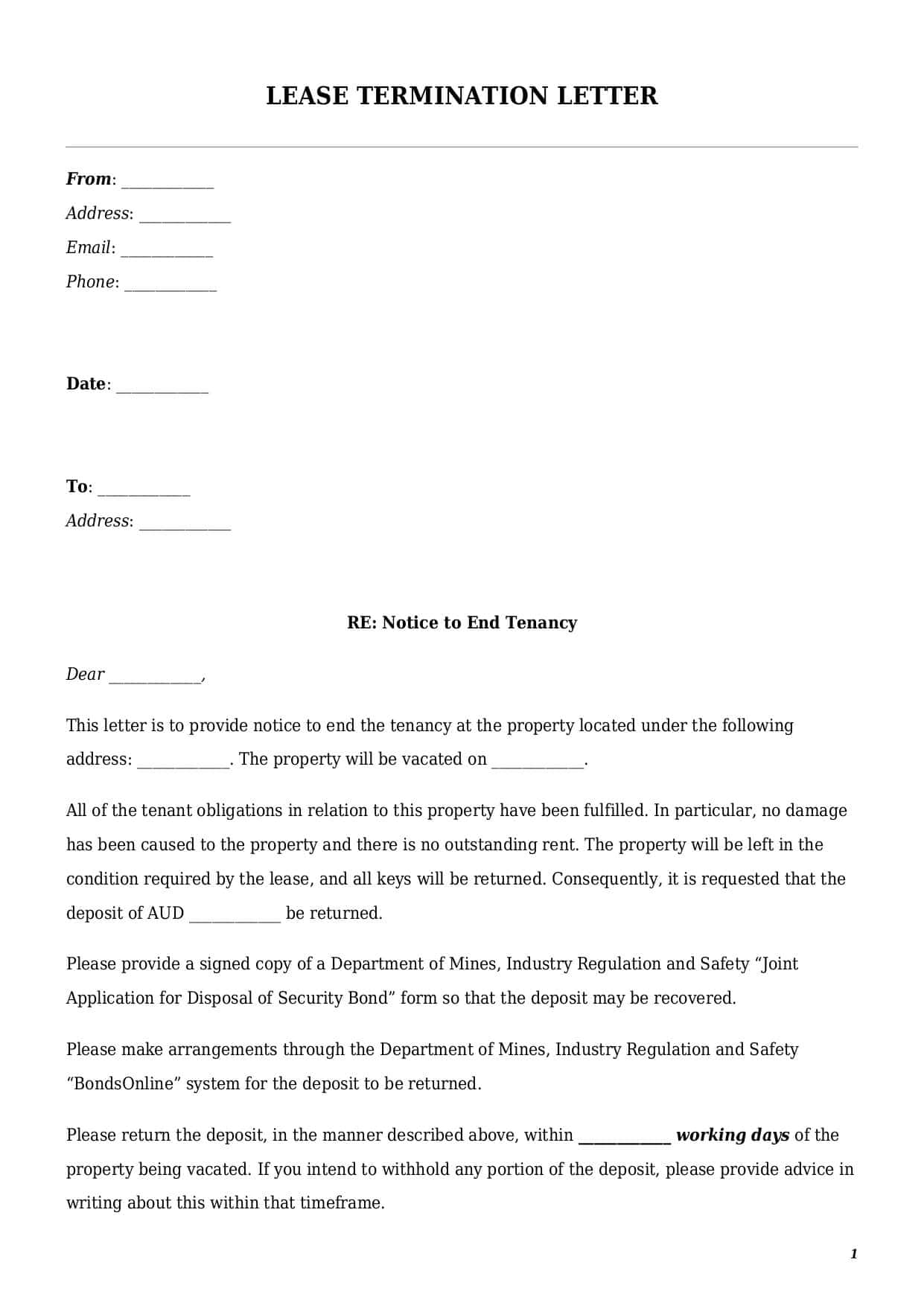 This document could be customised as both a normal and an early lease termination letter from tenant to landlord. The lease termination letter can be used to end any type of commercial, retail or residential tenancy in all Australian states and territories.