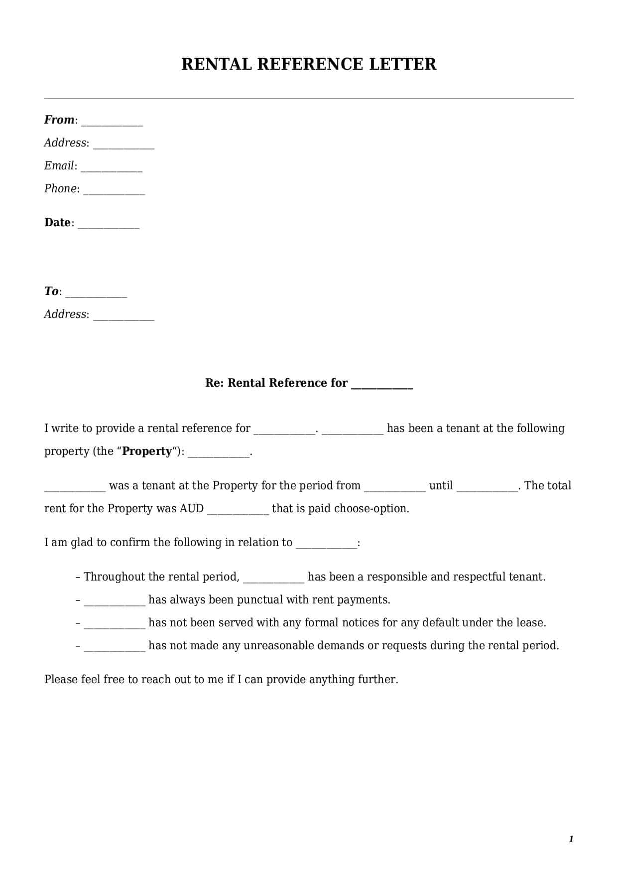 In Australia there is no state or territory legislation that prescribes the format or content for a rental reference template letter. While landlords and property managers can include any information they consider appropriate, a solid rental reference letter example must contain: