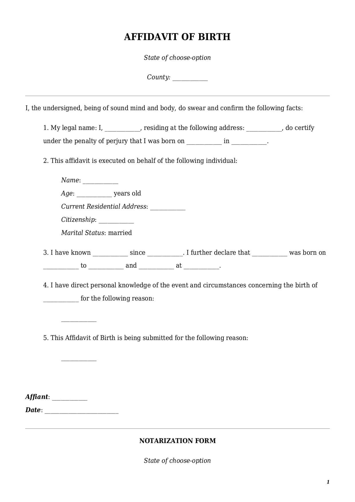 While neither federal nor state law defines an affidavit of birth format, this is a standardized legal document that shall include the following information: