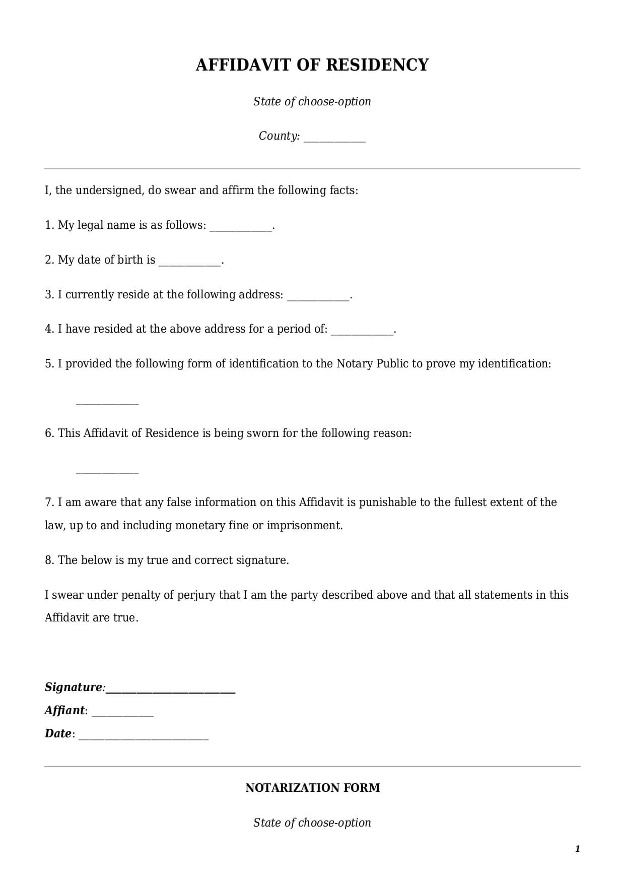 The text of a document must always include a reference to the name of a state and a county where this document is being notarized. For instance, an affidavit of residency Texas means that this affidavit is notarized in the state of Texas. Usually an affiant notarizes the document in the same county and state where they reside.