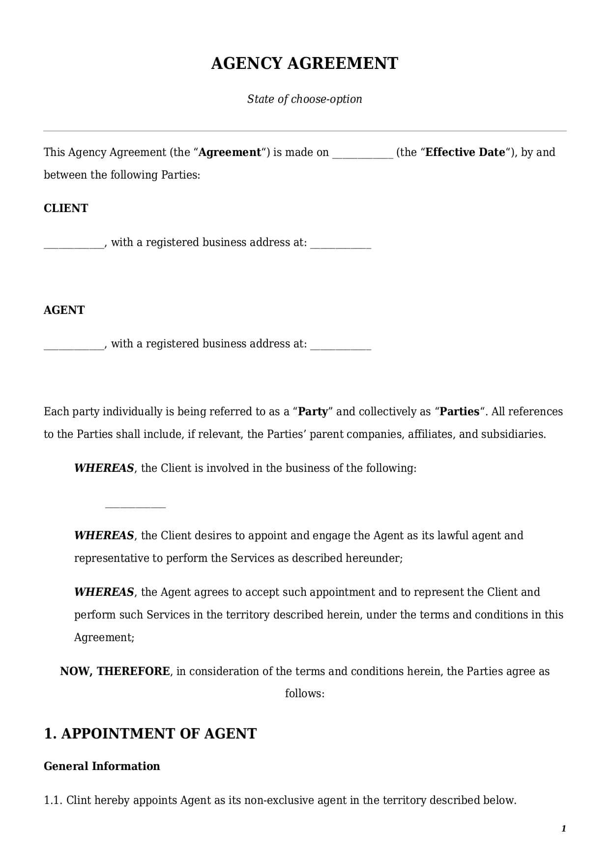 The present contract could be of two different types—a non-exclusive or exclusive agency agreement. Under a non-exclusive agreement, either party can enter into similar agency agreement templates with third parties without any limitation. While under an exclusive agreement, a client undertakes to not engage any other third-party agents for the provision of similar services defined under the present Agreement.