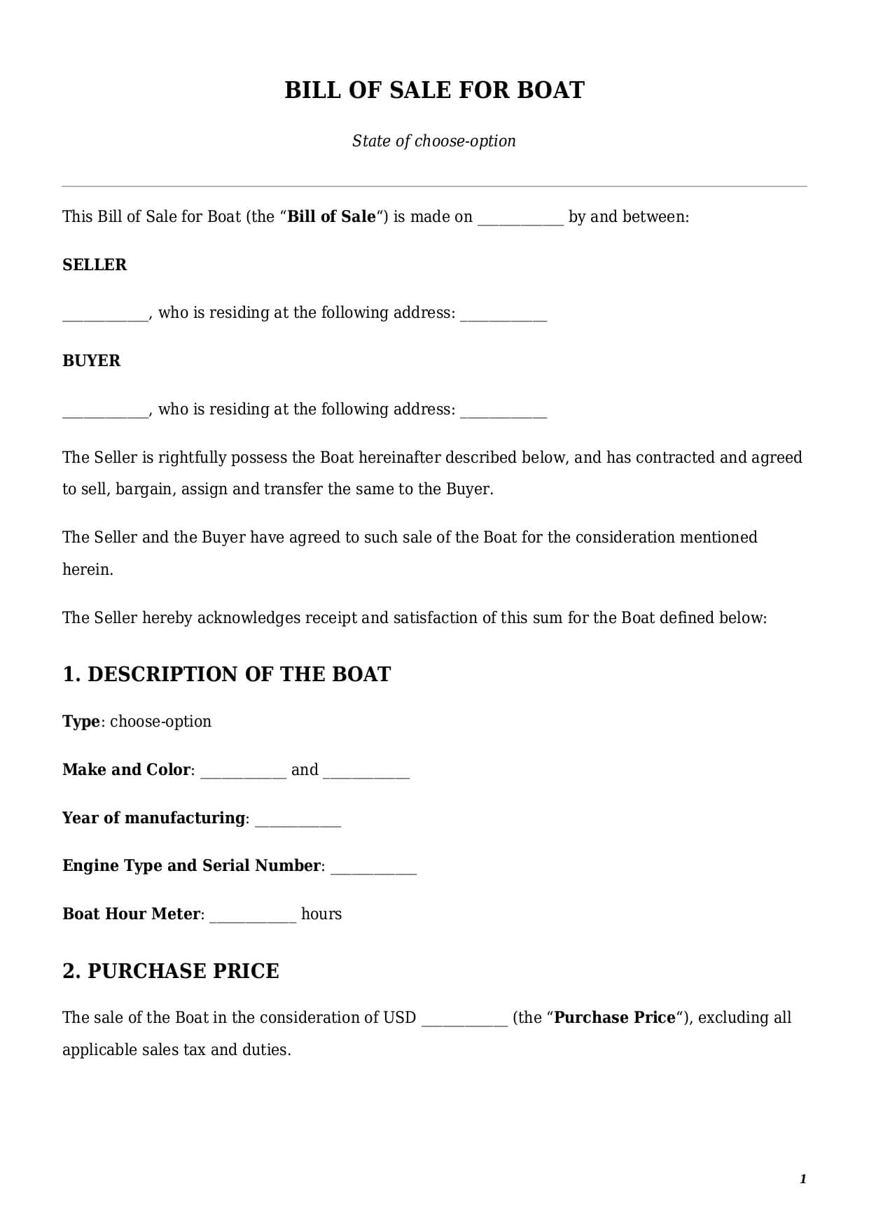 To make a legally enforceable boat bill of sale template, include in the text of a document the clauses below: