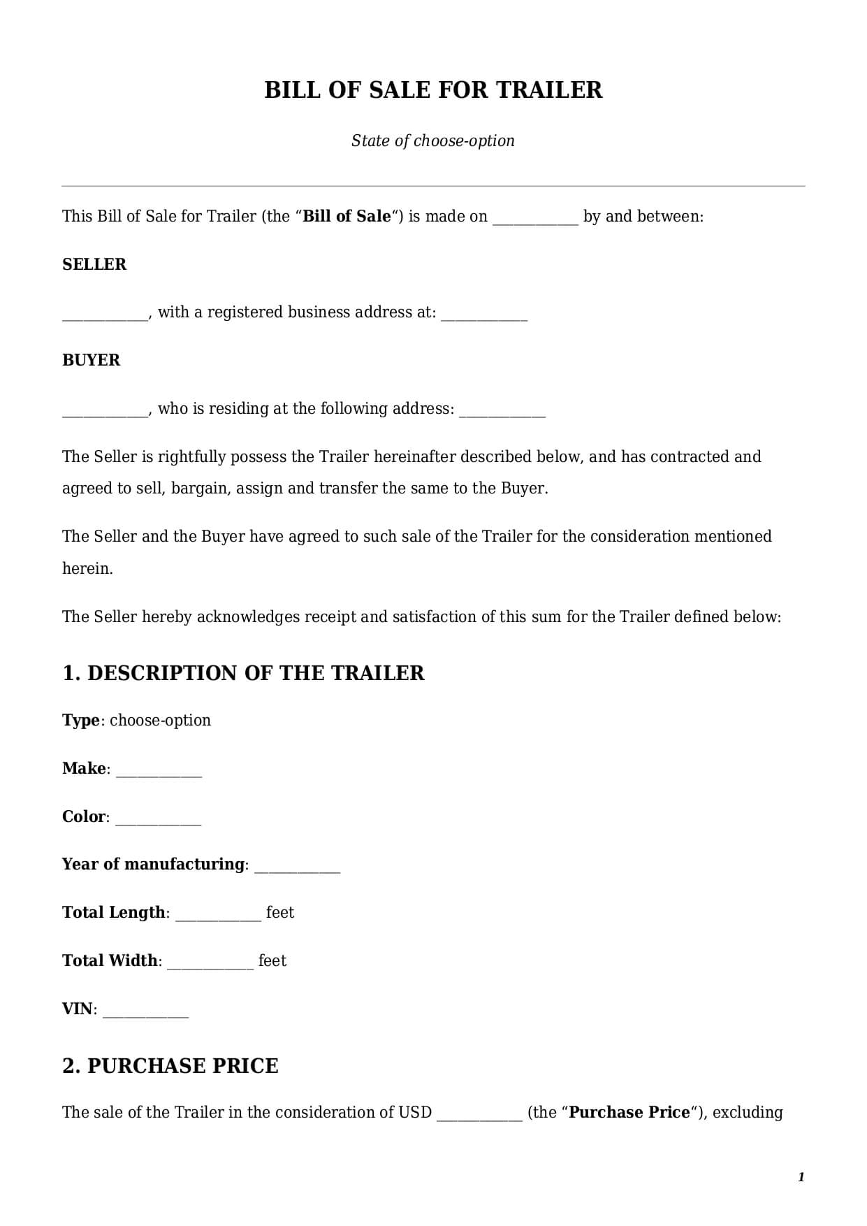 - Payment Terms. Usually a trailer bill of sale template must define only a purchase price, excluding all applicable taxes like sales tax, etc. However, parties can also include acceptable payment methods a buyer shall use to pay for a trailer.