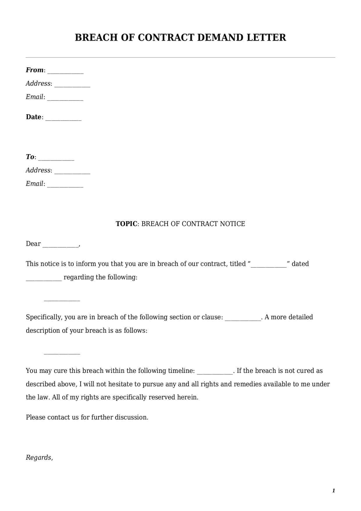 In simple words the breach is a direct violation of certain provisions of the original contract. Therefore, a well-drafted breach of contract letter template must specify (1) the nature of the breach and (2) the exact clause or provision of the original contract that has been violated.