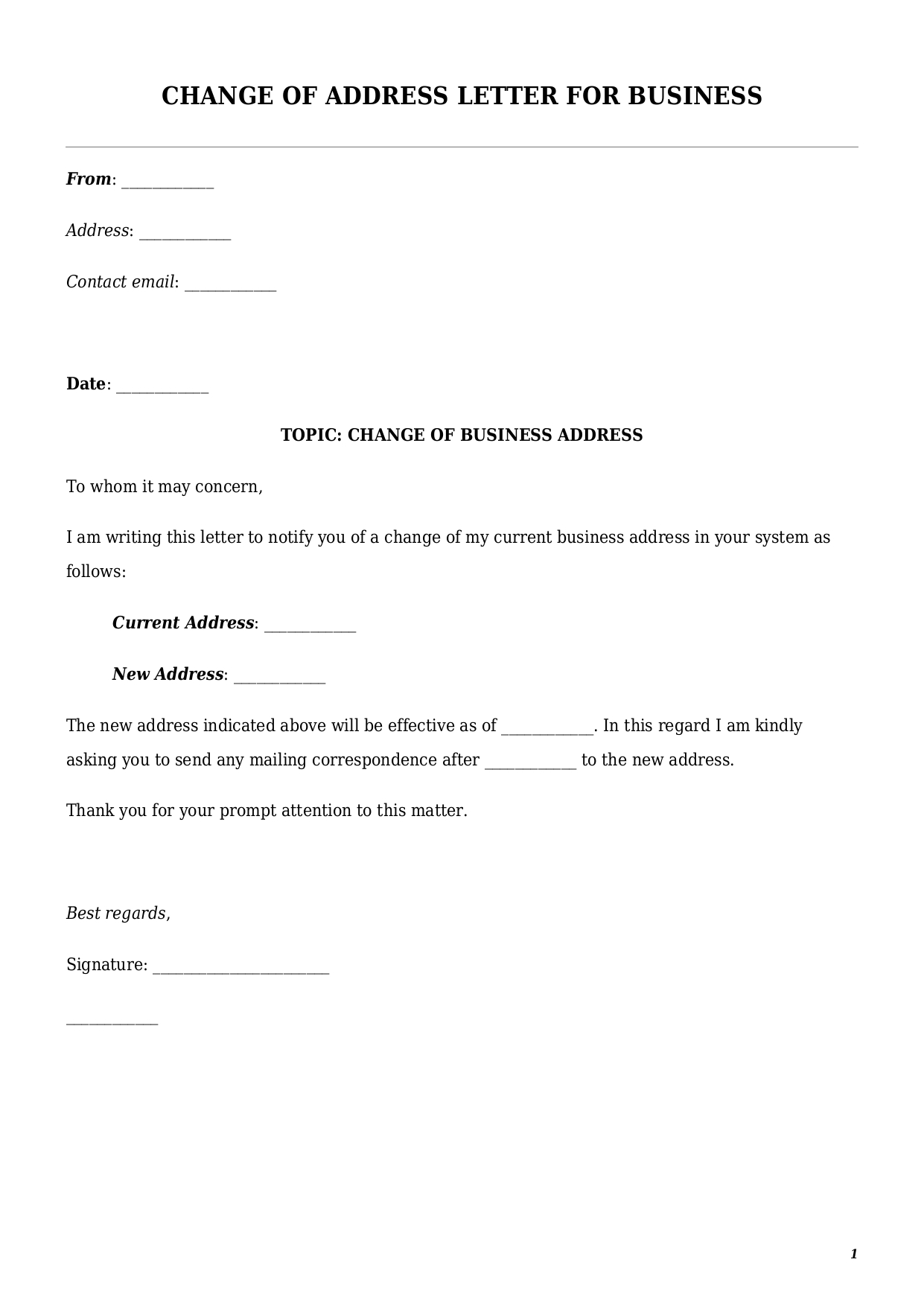 A change of address letter for business is a formal written communication used to inform contractors, clients, customers, or state authorities about the change of the sender’s business address. This document ensures continuation of business relations between the parties, as well as helps to keep the record of accurate information.