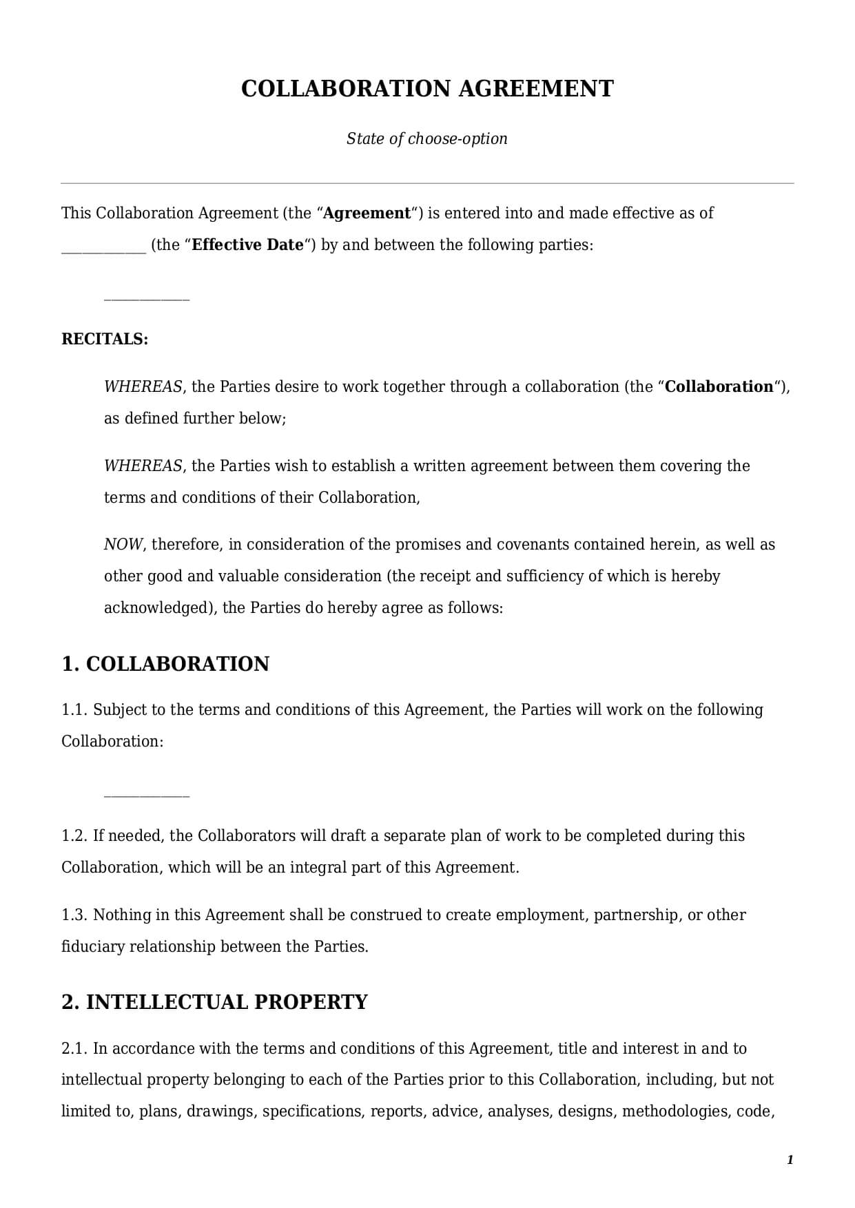 A collaboration agreement is a legal document that defines terms and conditions for cooperation between several parties towards achieving specific goals. The collaboration agreement template is a vital legal tool that is being used widely in business development, real estate markets, scientific research development, startups, and other domains. The basic collaboration agreement usually covers: