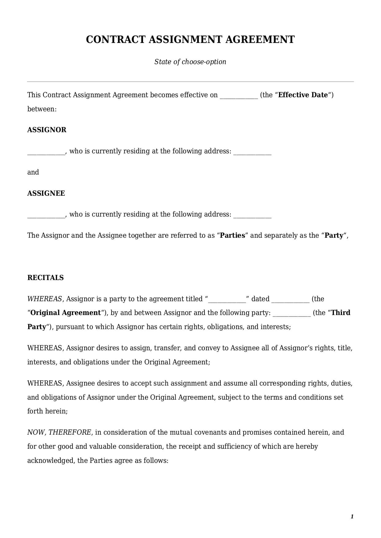 A contract assignment agreement is a legally binding document that allows one party to transfer their rights and obligations under an existing contract to another party. The document’s template usually outlines the following terms and conditions for the assignment: