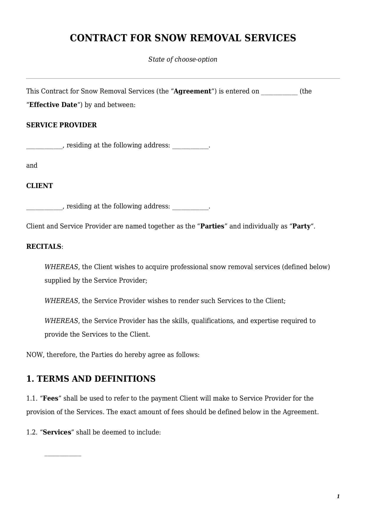 The parties involved in a snow removal contract are the client and the service provider. The client is an owner, property manager, or tenant of a property that needs to be cleaned of snow. The present template will be suitable for various types of properties, including residential, commercial, farms, land plots, etc.