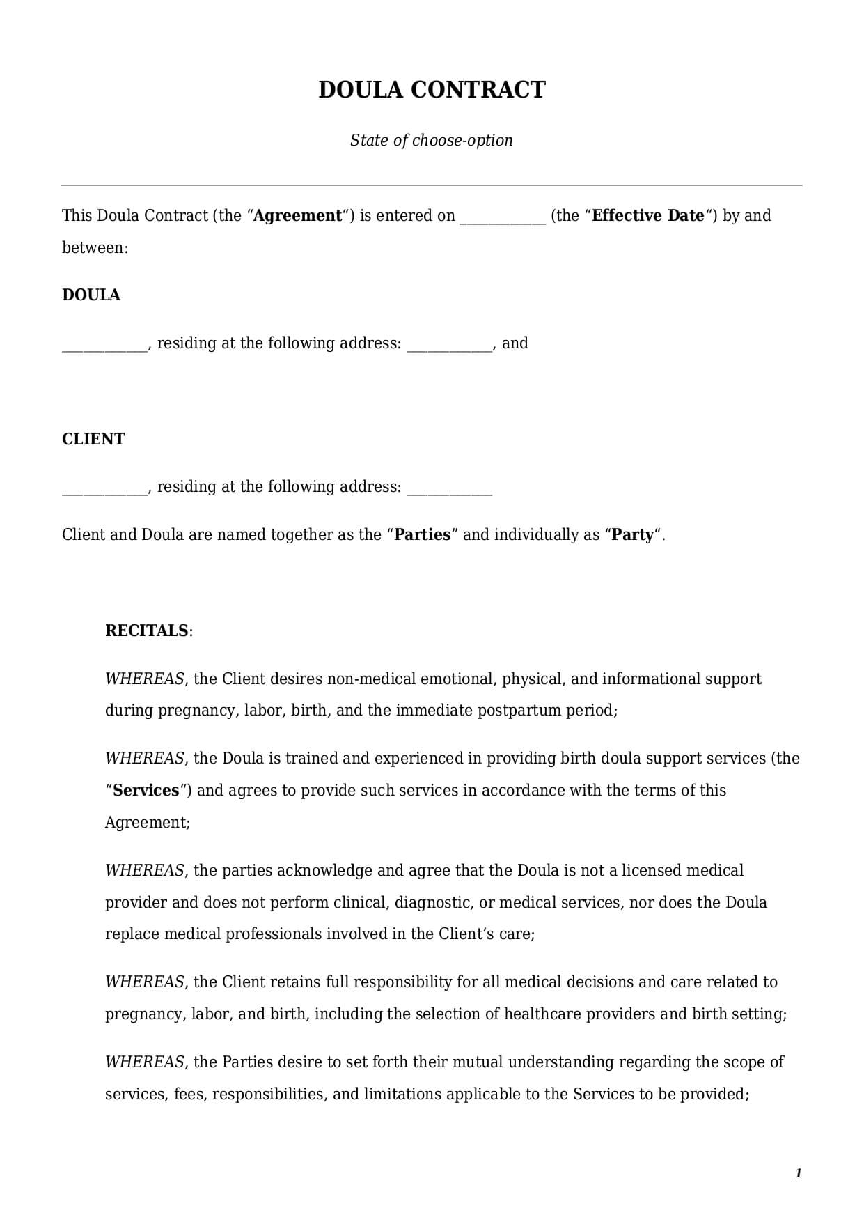 Postpartum doula contract. This part includes the provision of qualified non-medical help related to a smooth recovery from a birth. Parties have to discuss not only the scope of services but also the exact duration within which those services shall be provided.