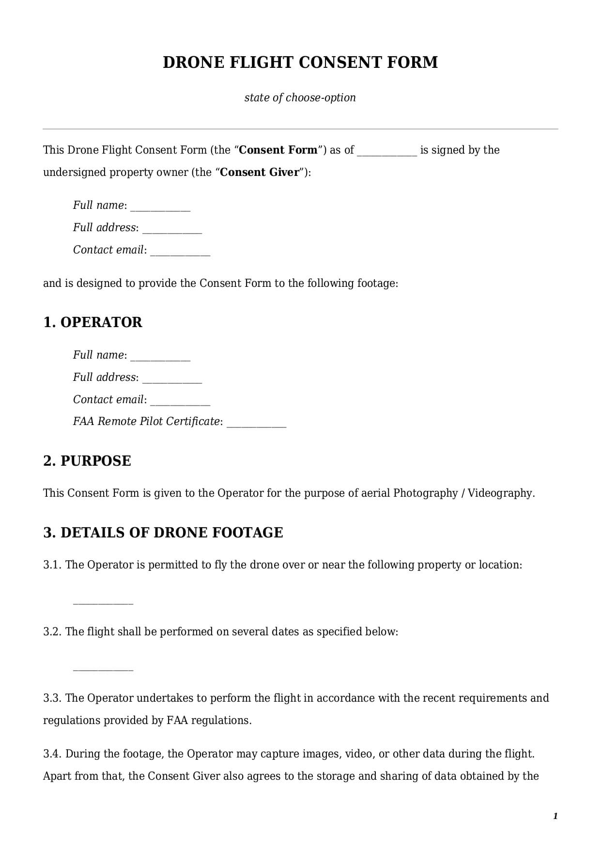 - Details of the parties. The text of a consent form should include the full name, residential address, and contact email of both a consent giver and operator. Apart from that, the flight authorization needs to include the name of a state where the consent giver currently resides. The laws of this state shall automatically apply to the provisions of this form. Finally, it is very important to include details of the operator’s FAA certificate allowing them to operate the drone. If the person does not have such a certificate, the drone footage could be performed under the close supervision of a person who has such a certificate.