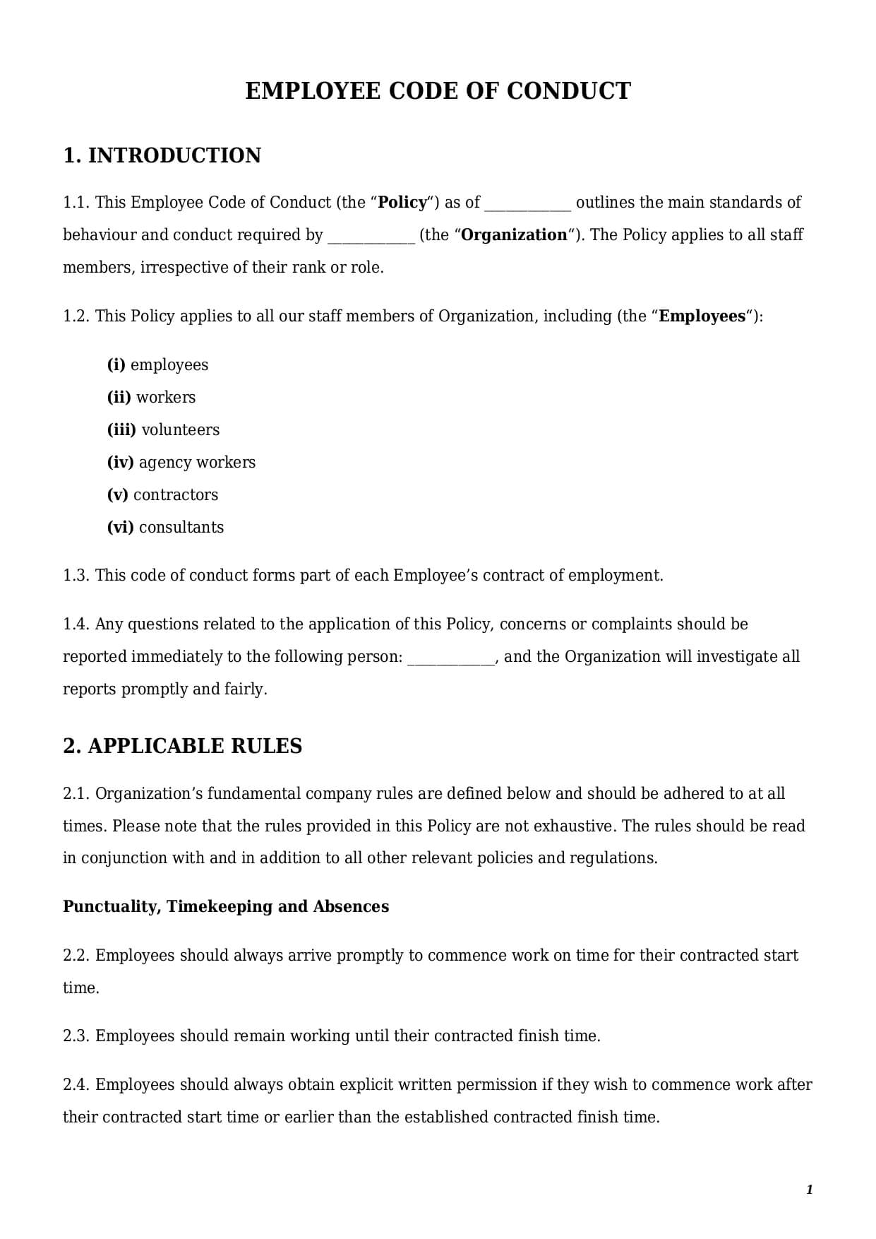 Most employee code of conduct templates focus their attention on how employees shall dress while at work. Rules for dress code may apply towards all employees or only to several categories (e.g., employees who have direct access to the organization’s customers or clients).