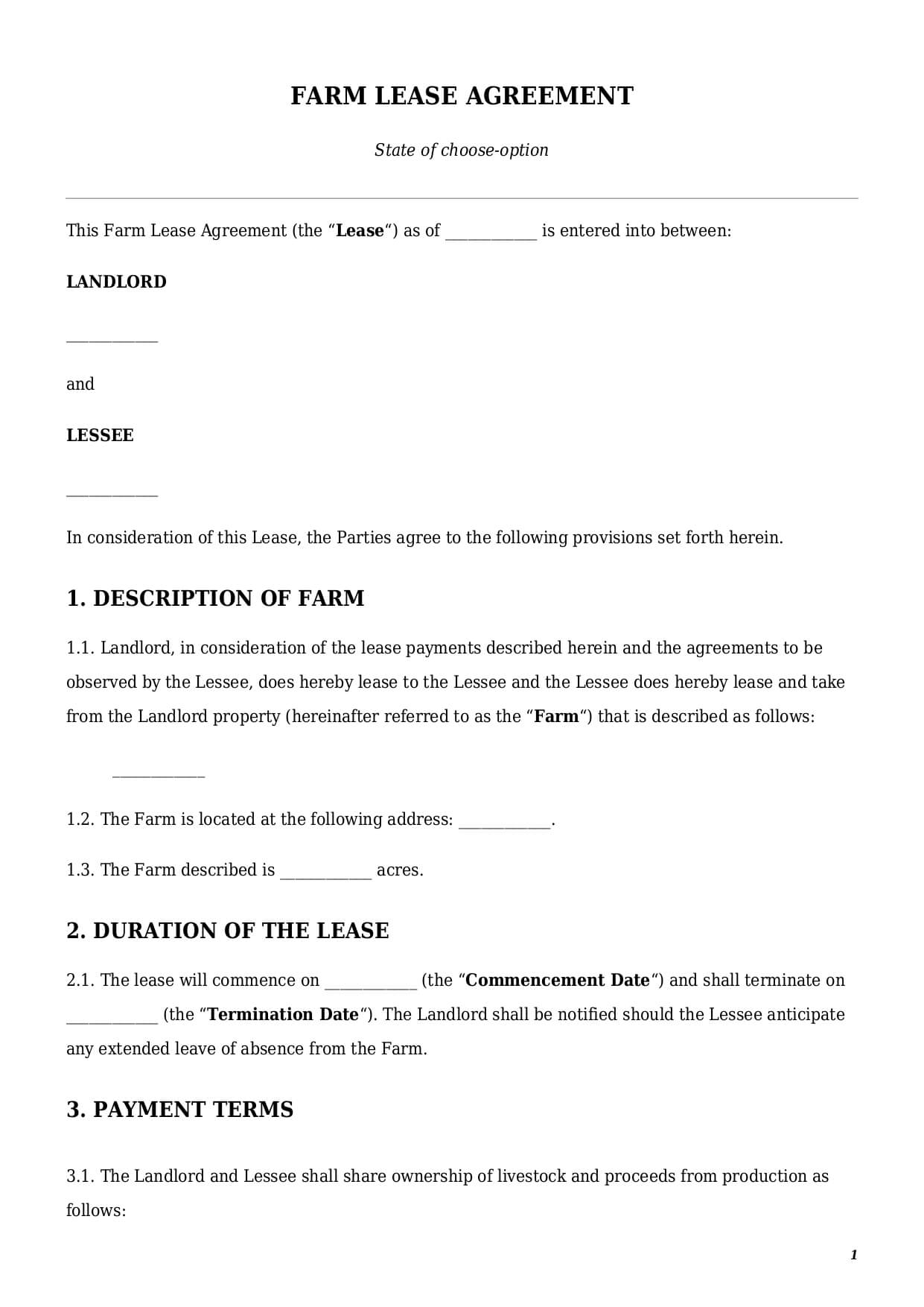 The law does not define a form for a farm land lease template. Therefore, parties are free to incorporate any provisions they want. At the same time, inclusion of certain clauses is essential to ensure the coverage of all important elements of the lease, like farm description, parties’ details, amount of rental payments, and lease duration.