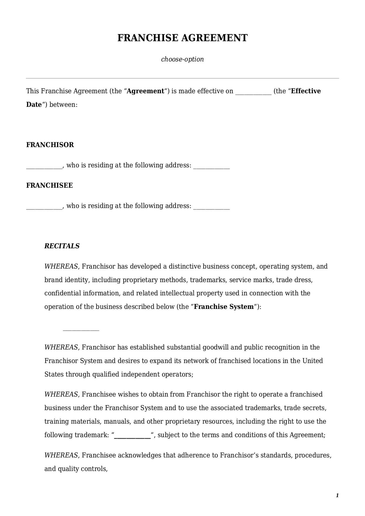 A franchise agreement is a legally binding contract between a brand owner and a franchisee (the business operator). It outlines the rights, obligations, and rules each party must follow when operating under the franchise brand in the United States.