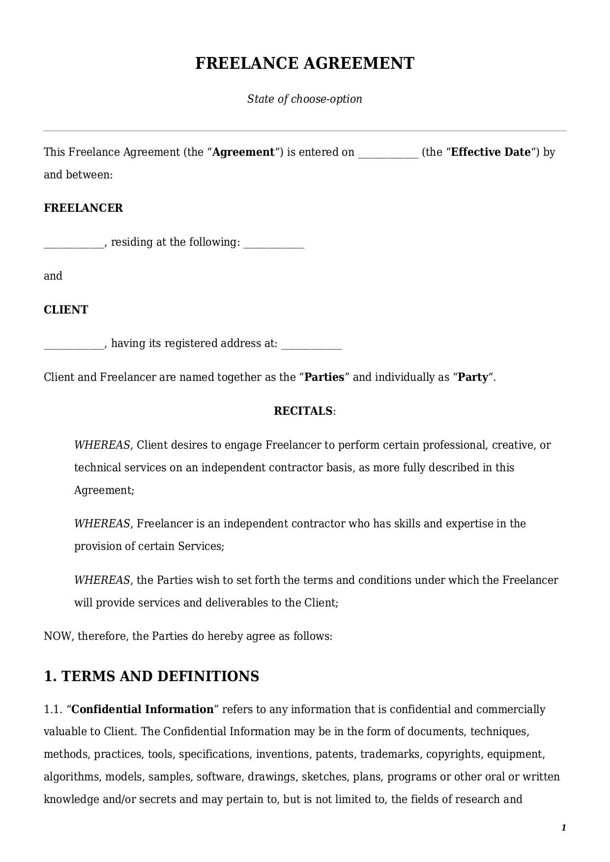 A solid freelancer agreement template includes a standard confidentiality clause to protect a client’s sensitive information against disclosure. In the course of cooperation, a freelancer may get access to the client’s non-public or trade secret information. If this clause is included, it means that the freelancer cannot disclose any information not only during the period of a freelancer contract but also within one or several years after its termination.