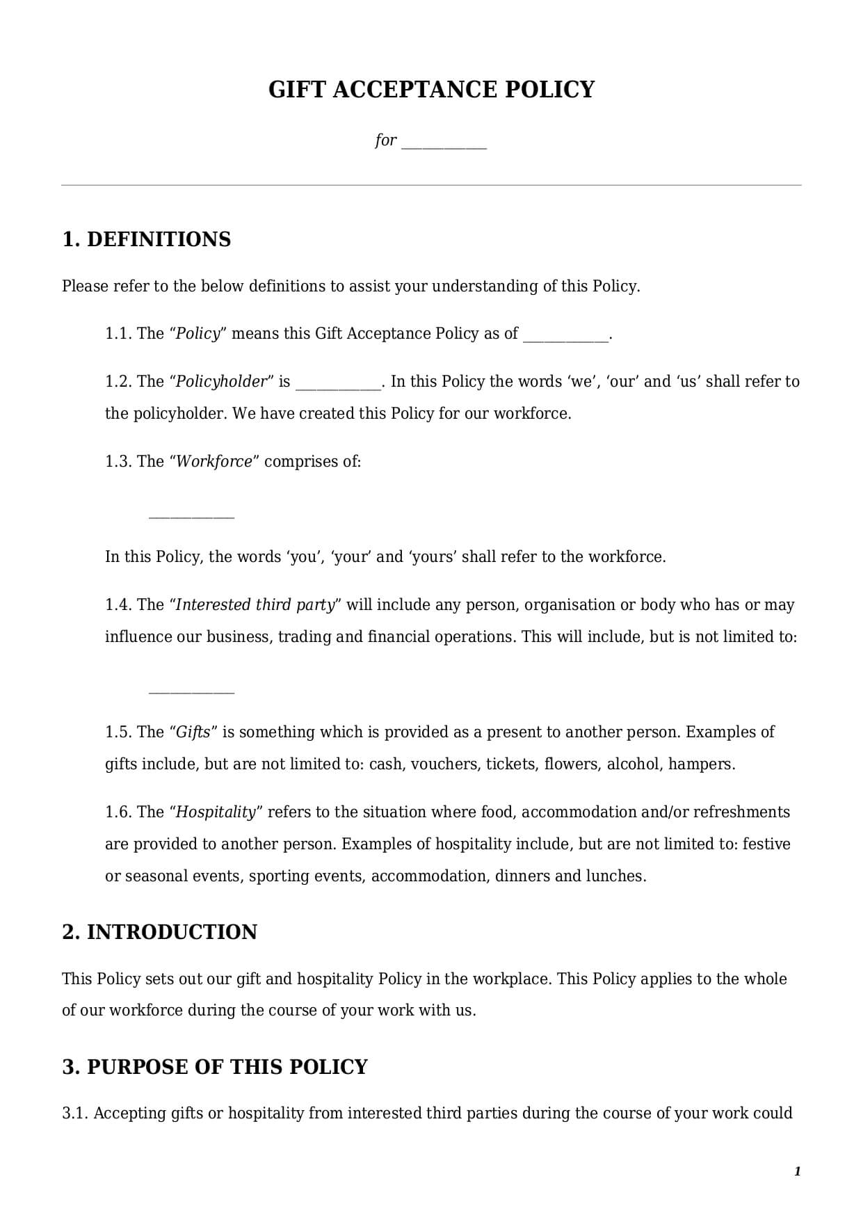 The text of every gift acceptance policy shall define the full name of the nonprofit organization, the policy’s purpose, and the definition of used terms.