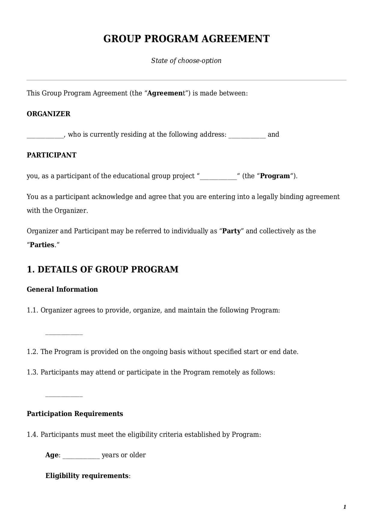 Drafting a group program agreement template requires inclusion of a number of essential provisions. Without those provisions a document’s template cannot become an enforceable legal document. Below we made a short list of clauses you have to include in your group program contract: