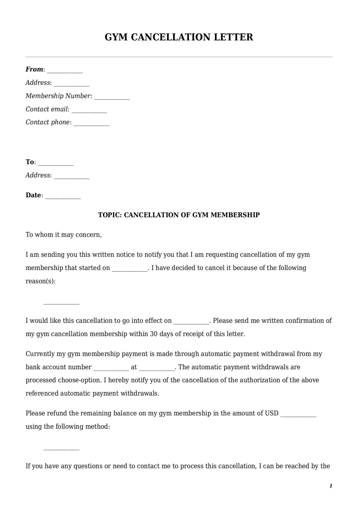 • Refund. You can also request in a letter of cancellation for gym membership a full or partial refund. However, before doing so, we would recommend reading a gym’s cancellation or refund policies to make sure you have a right to the refund.