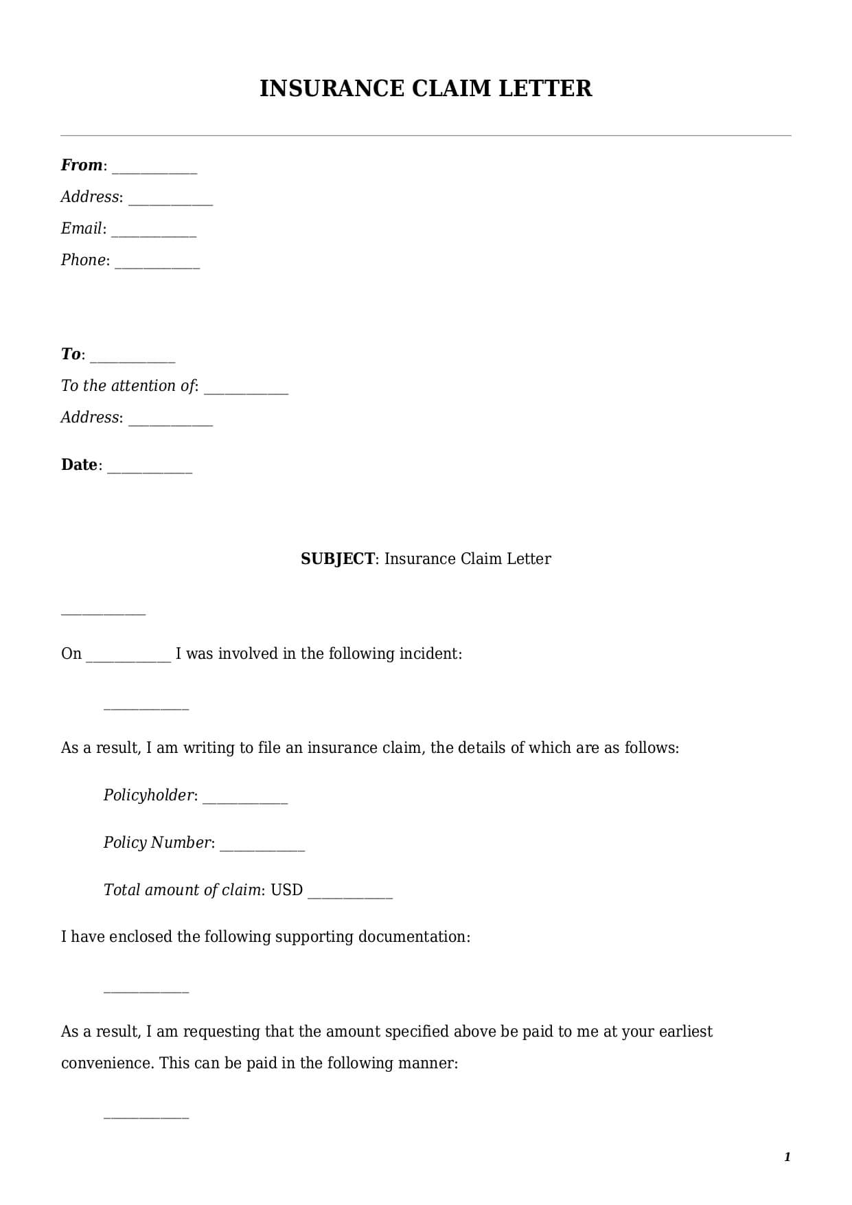 The request’s subject does also influence the letter’s content. For instance, in the case of a medical insurance claim letter, it is also important to name the doctors involved in medical treatments. When it comes to an insurance claim appeal letter, it is always recommended to provide additional details of an incident that were not revealed in the original letter.