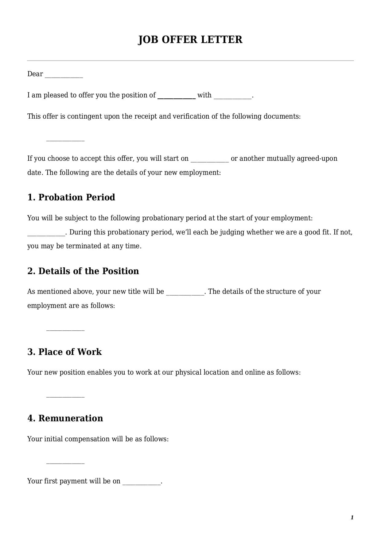 - timeline. Even a simple job offer letter template shall provide a clear timeline. First, the letter must include the first working day in the company. Apart from that, if an employer plans to establish a probation period, the duration of a probation period should also be mentioned.