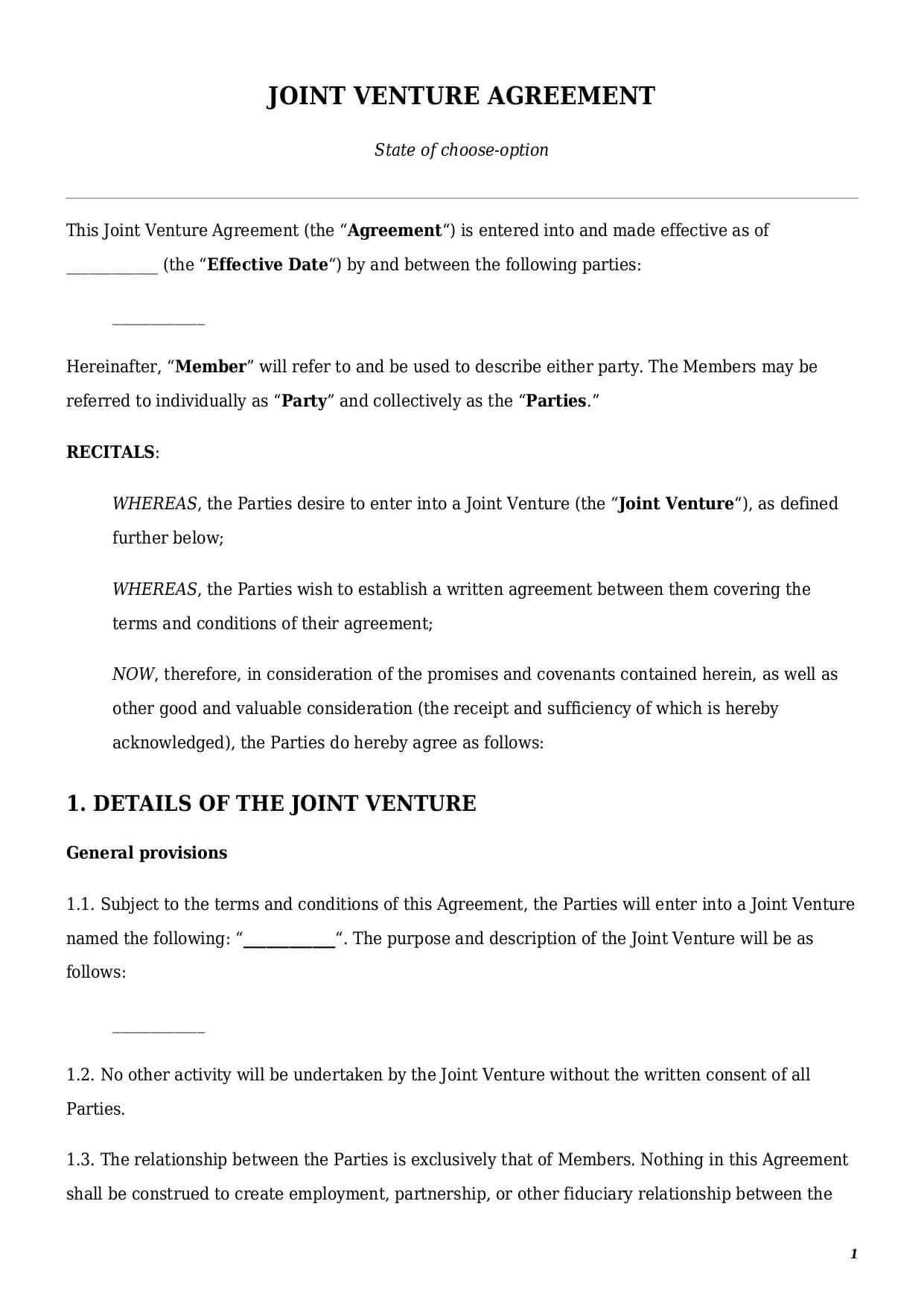 The law does not define a joint venture agreement format. At the same time, without certain provisions, a document may not be complete or enforceable in the court. A strong and legally sound joint venture agreement template must cover the following: