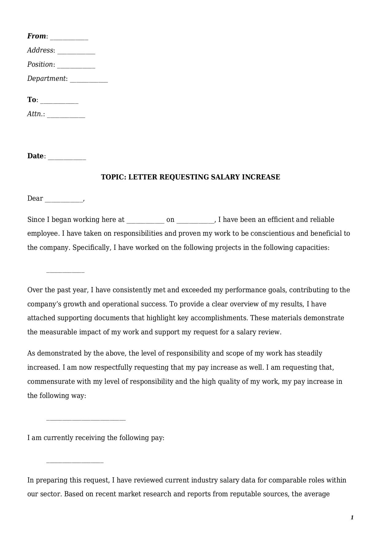 • Clear Purpose of the Letter. The topic of the letter should clearly signify an employee’s request to get a pay raise.