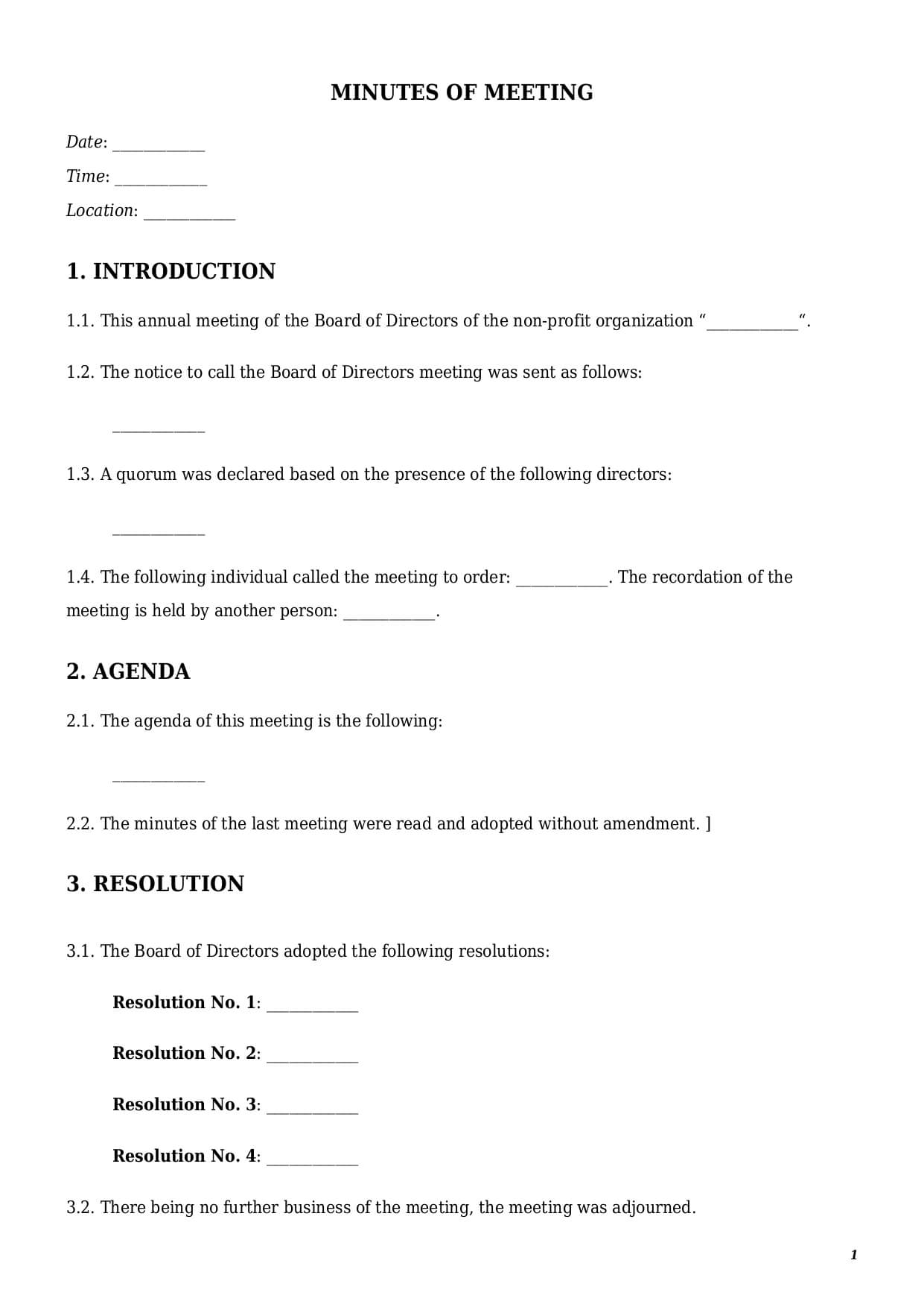 The text of every nonprofit board meeting minutes template lays out a detailed description of the meeting’s agenda. The agenda is the list of questions or topics participants wish to discuss and vote on. The topic included into the agenda may include anything related to the organization’s daily activity and management.