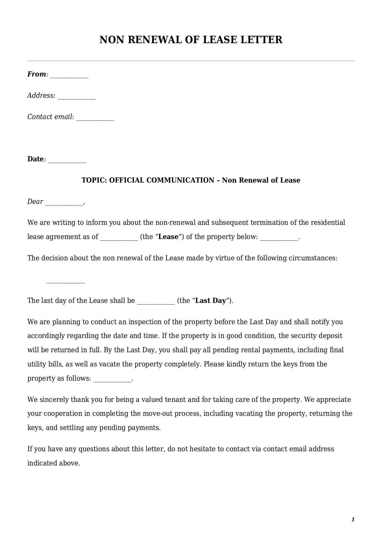 - Termination details. Every letter of non renewal of lease lays out details of the termination process. Those details include the move-out date, conditions for the return of the deposit, rules for returning the keys, etc.