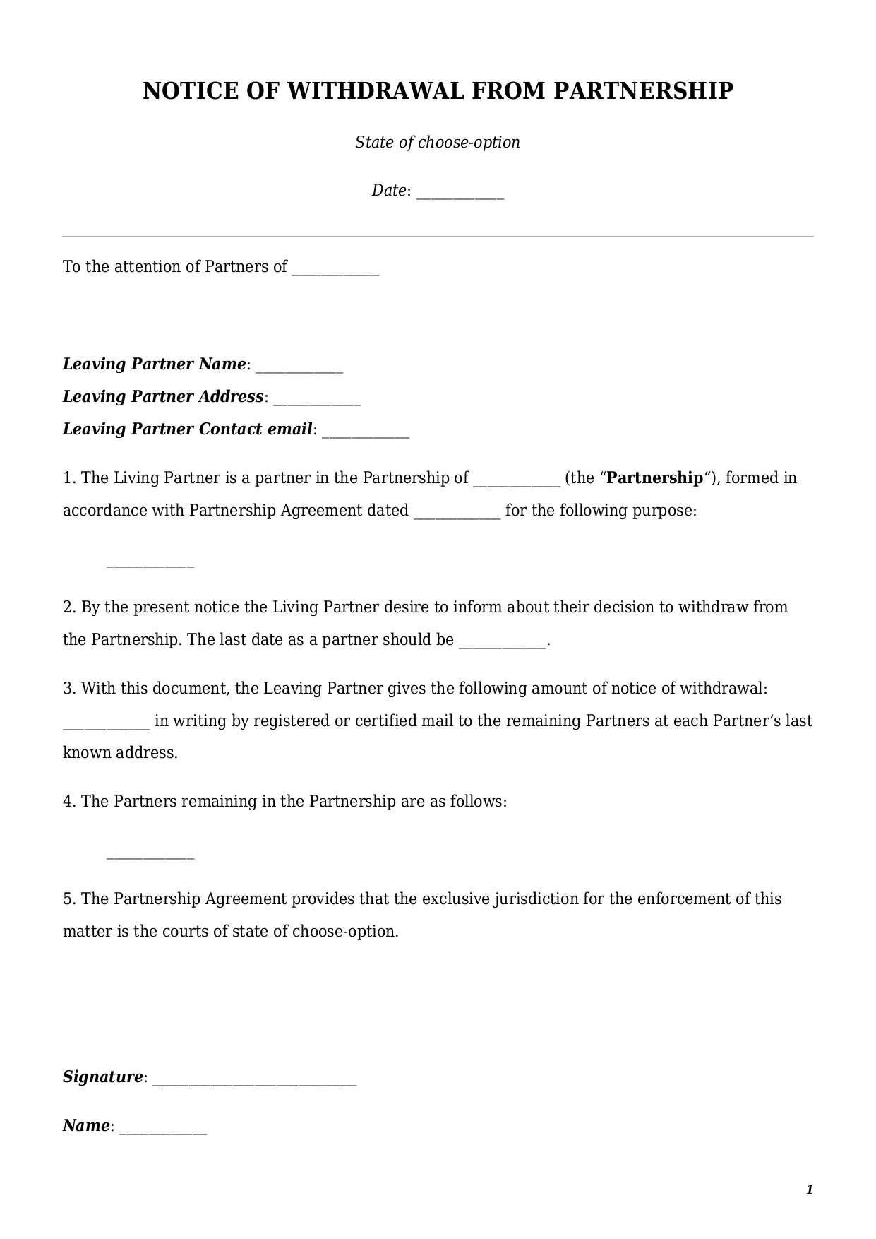 In case of a partner withdrawal from partnership, timing is key. Thus, a well-drafted letter template shall provide: