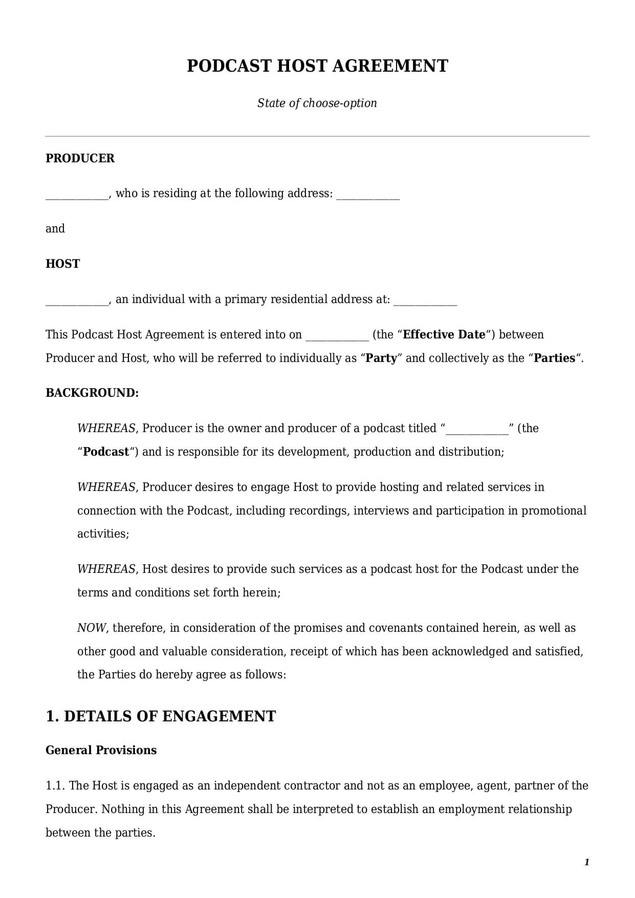 A podcast contract agreement is not an employment contract. This is a contract between two independent parties. One party is an owner of a podcast who wants to promote and produce it further. Another party is an individual who is being invited to become a host of a podcast. In a podcast agreement: