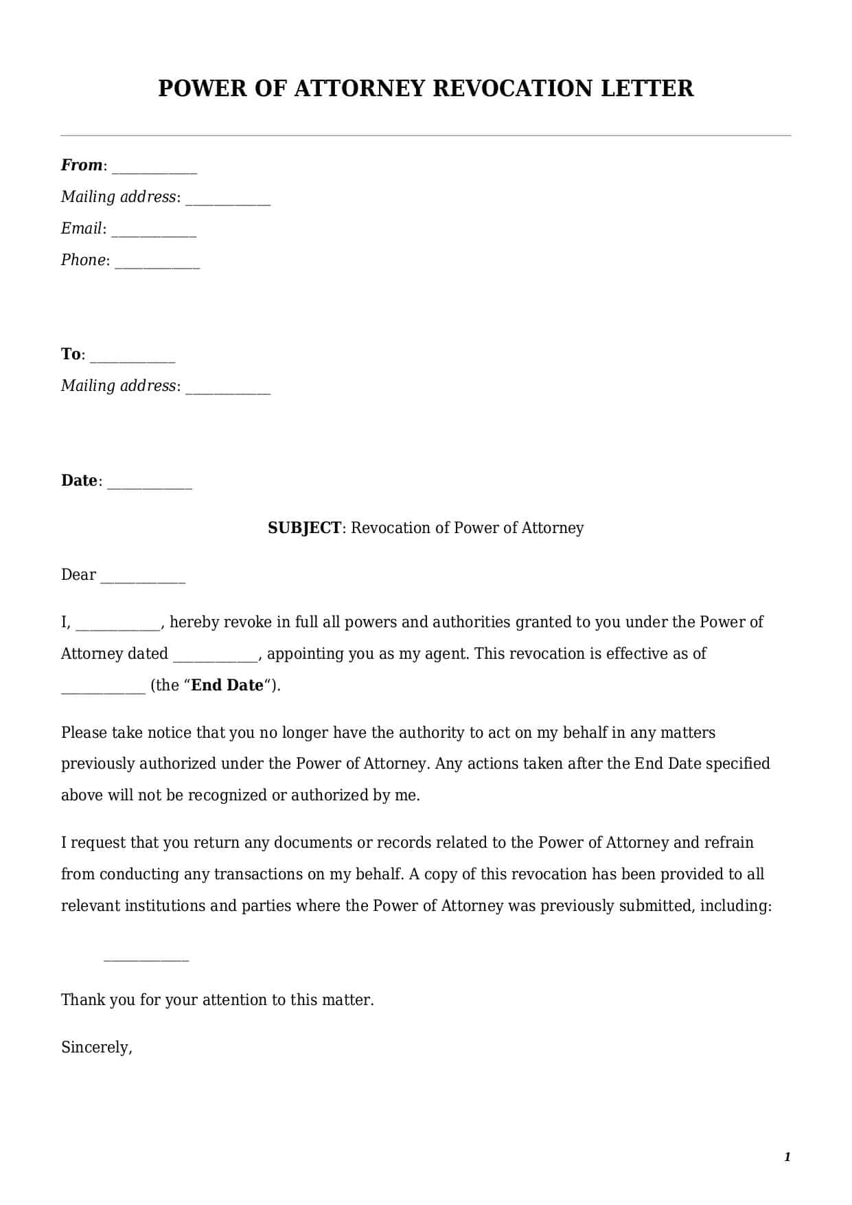 Last but not least, the notarization of this letter of revocation of power of attorney template is only necessary when the original power of attorney was notarized.
