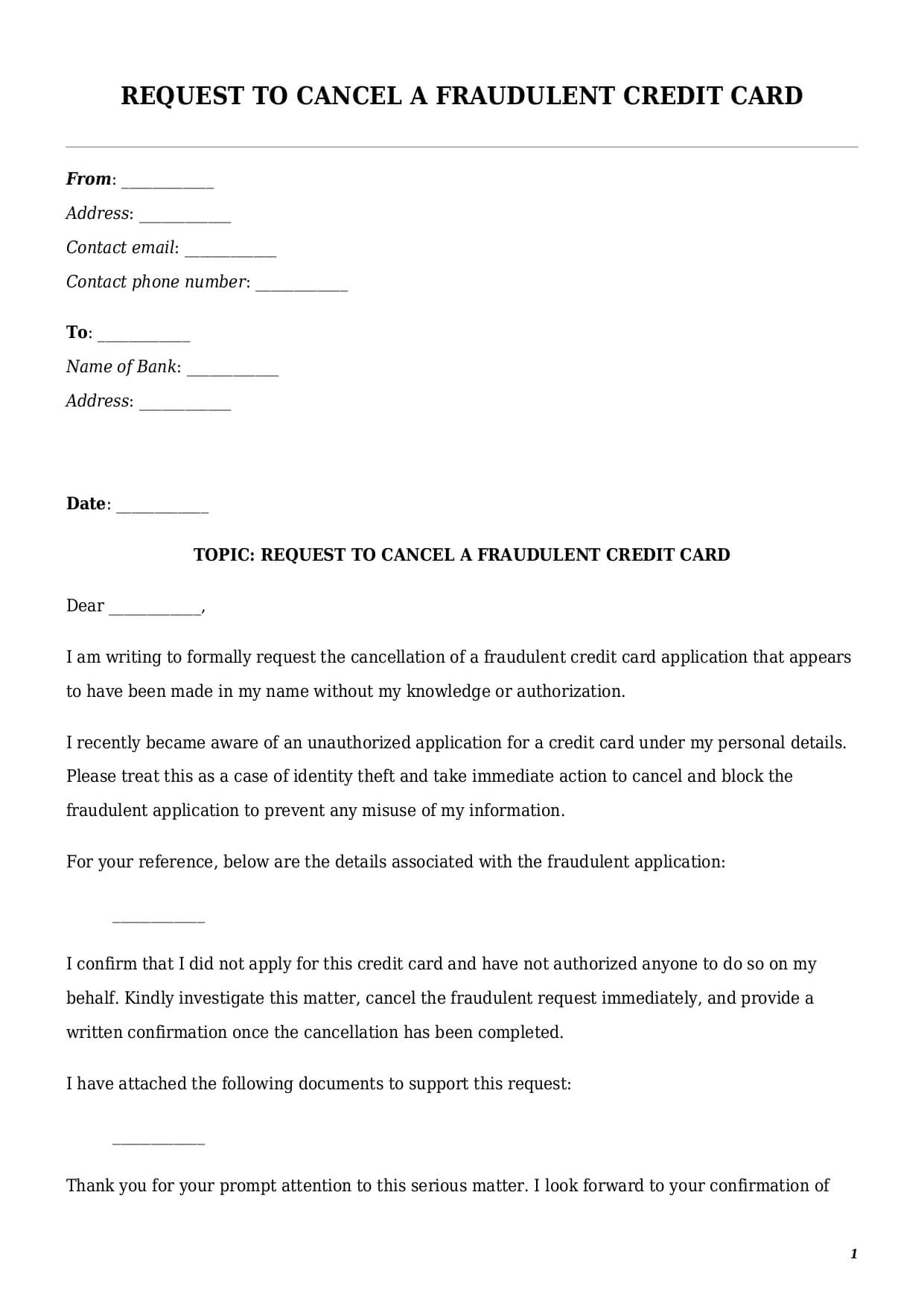 A request to cancel a fraudulent credit card is a formal written document a cardholder sends to their bank to inform about a security issue or suspected fraud.