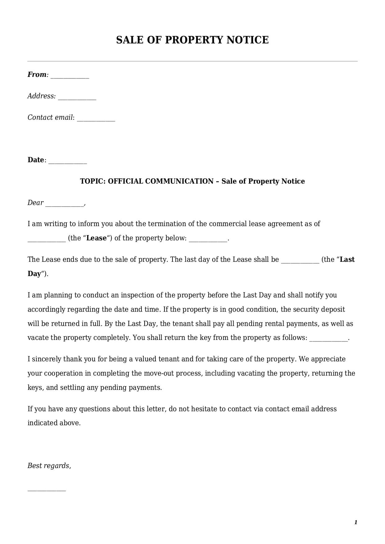- Details of the lease. The text of a sale of property notice sample needs to clarify the full name and date of signing of the original lease agreement. Besides that, the landlord shall also specify the address of a rented property.