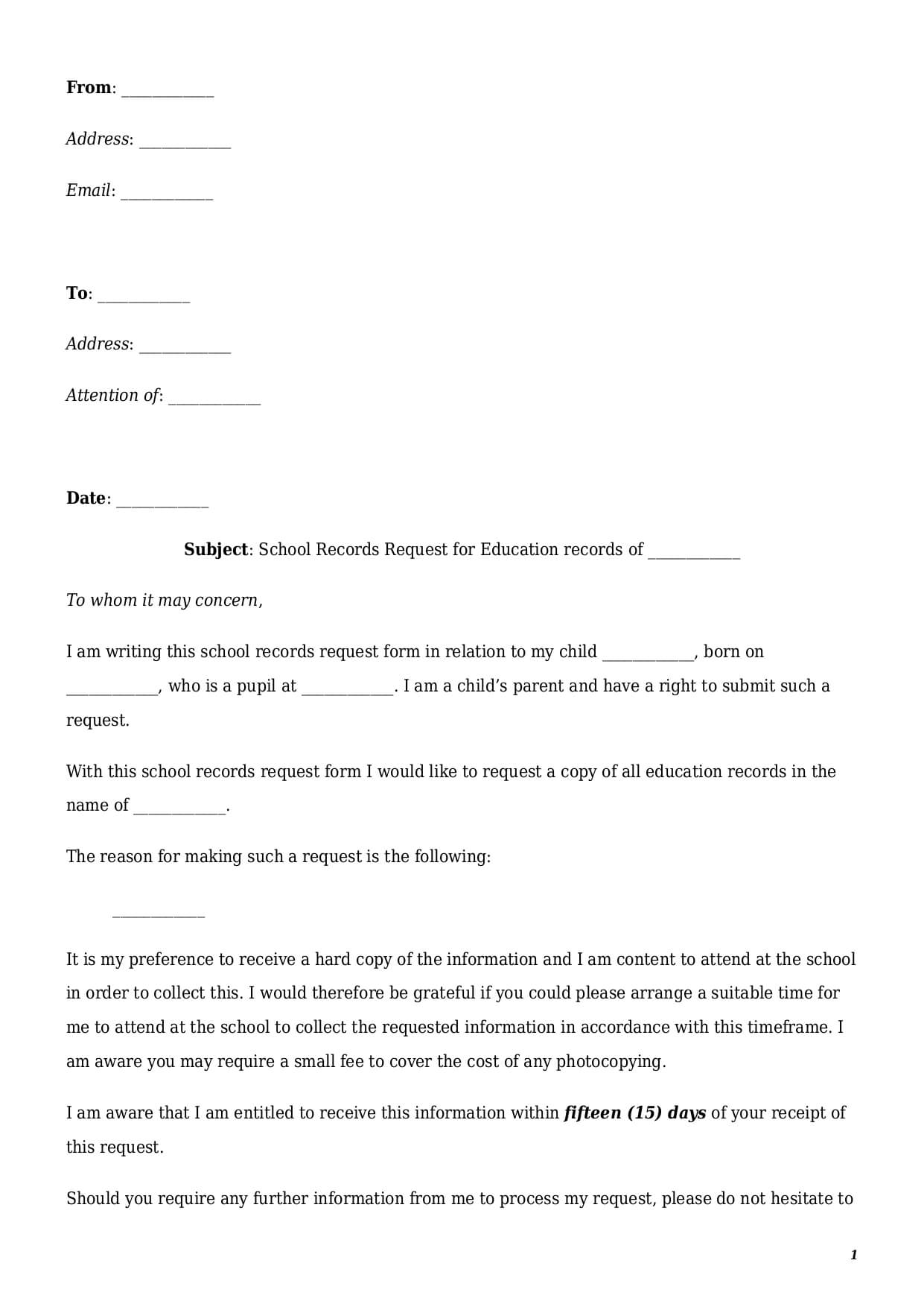 In the United States, the Family Educational Rights and Privacy Act (FERPA) provides a child’s parents and guardians with a legal right to request education records from school. There are two important considerations everyone should be aware of when using this template: