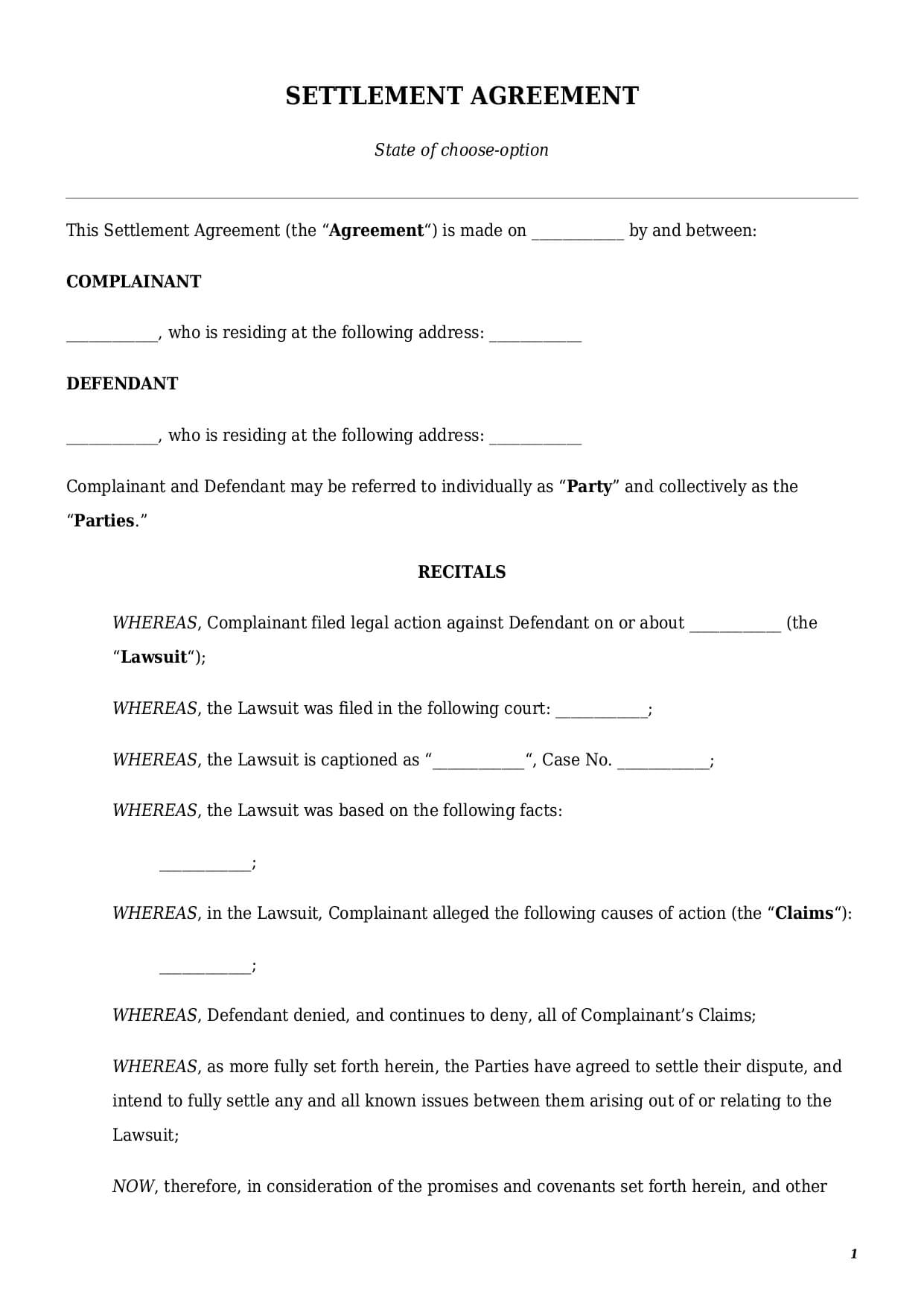 The parties involved in a settlement agreement are a complainant and a defendant. A complainant is an individual or a legal entity who filed a lawsuit. In practice a complainant is being referred to as a plaintiff as well. A defendant or a respondent is another party against whom the claim was brought.