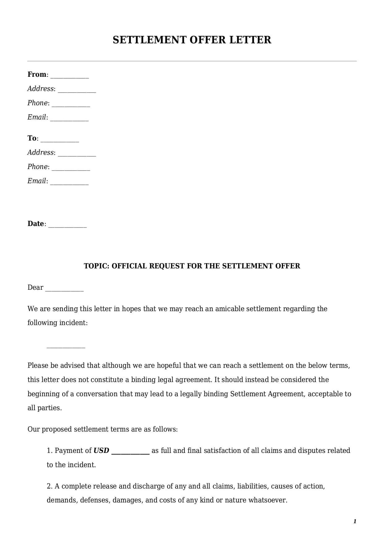 The heart of every legal settlement offer letter is the terms and conditions of a settlement. Most popular clauses that are normally being included are: