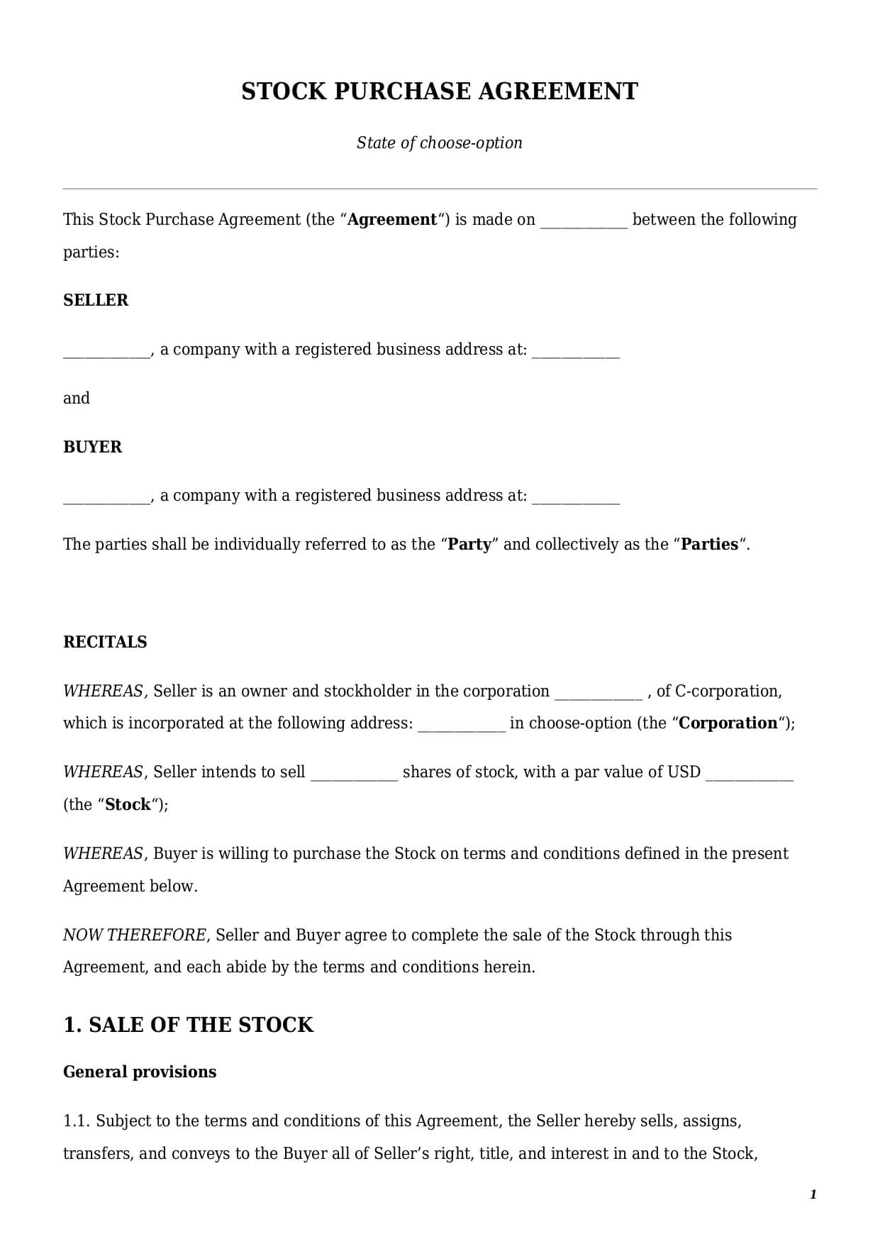 Parties to a sample stock purchase agreement are the seller and the buyer. The seller could be of two types: