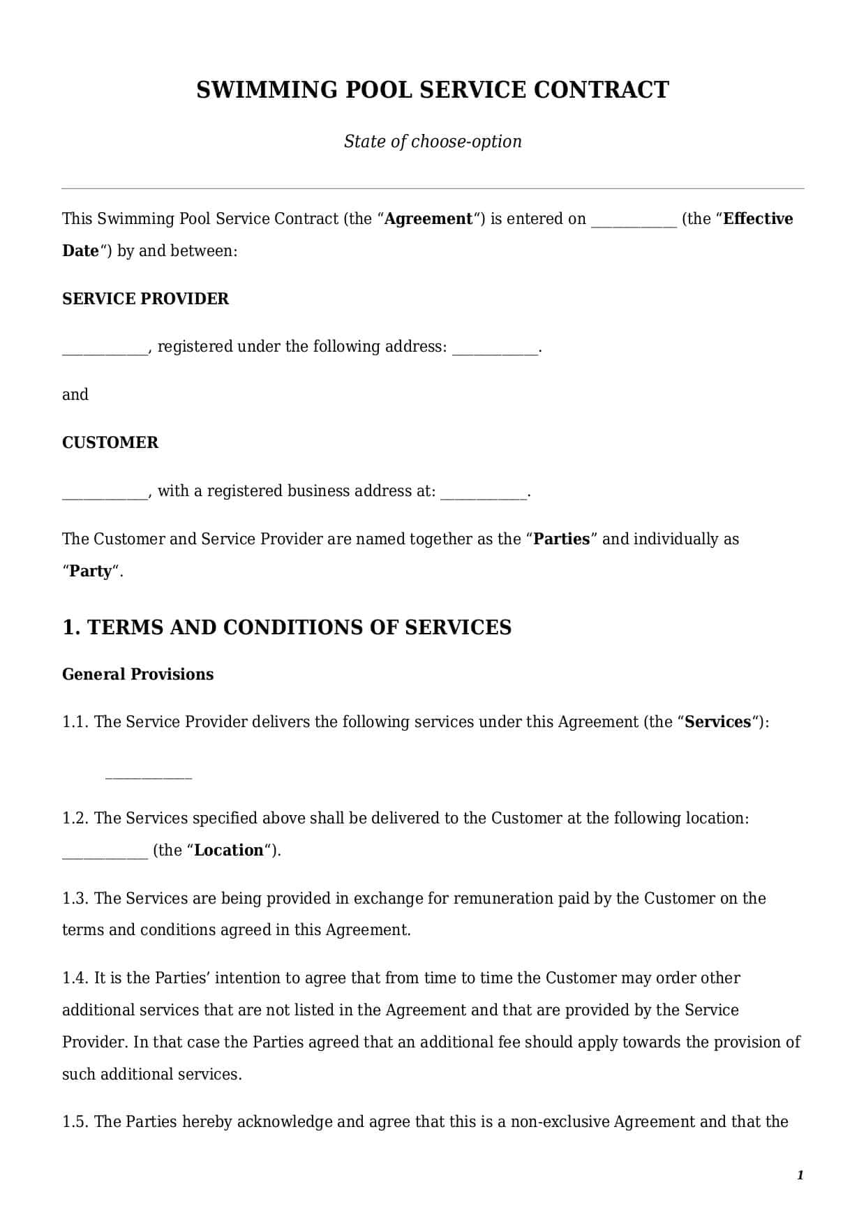 The “legal heart” of every swimming pool maintenance agreement is the definition of services. This clause is also called the “subject” of the contract, and without it the document cannot become complete. Always try to use clear and unambiguous wording when describing services to be provided.