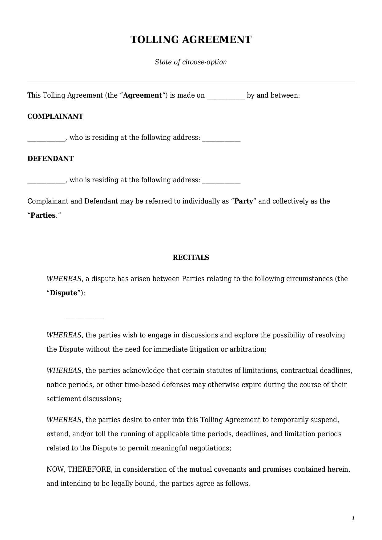 - Tolling date. This is the date by which parties undertake to negotiate to reach a solution for their dispute. Depending on the specifics of a case and applicable state legislation, the tolling date could be a fixed date in the future or a certain event in the future.
