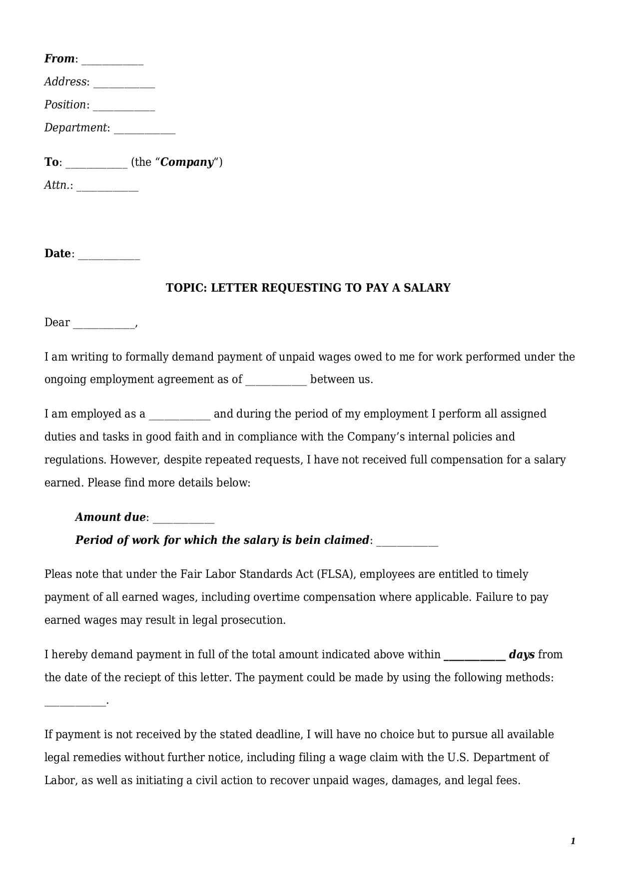 This letter of demand for unpaid wages is the first official step for informing your current or former employer about the non-payment of wages. If an employer keeps ignoring and does not pay a wage immediately, an employee has a right to escalate the matter further to the U.S. Department of Labor or courts.  In case of further escalation of a conflict between employee and employer, this unpaid wages demand letter serves as written evidence of an employee’s request.